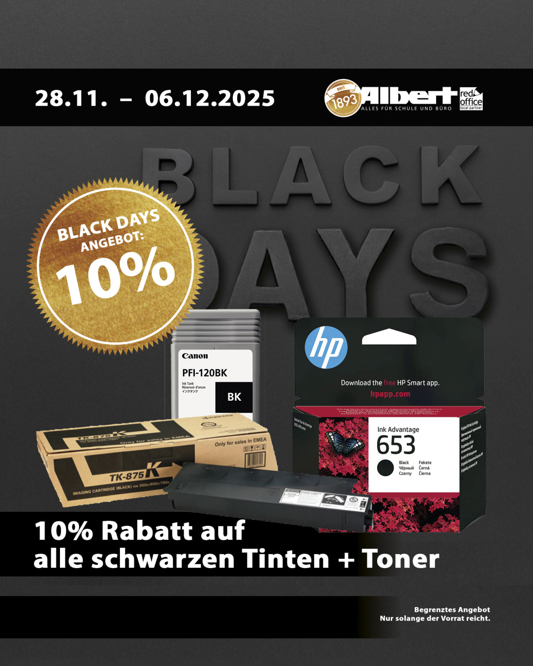 Außerdem gibt es 10% auf alle schwarzen Tinten und Toner – damit sie's schwarz auf weiß haben.